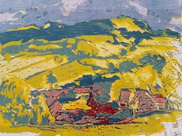 barevný linoryt, matrice a akvarel